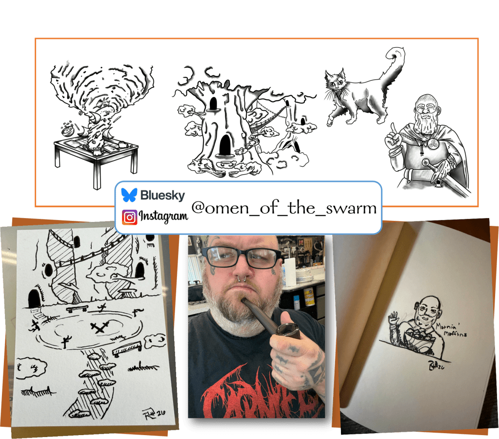 I continued to be forever DM for a while [always being the DM and rarely a player], learning about different RPGs and what OSR is and Mörk Borg. [OSR is “Old School Renaissance”—getting back to the basics and the feel of the original tabletop games. Mörk Borg is a unique, apocalyptic fantasy tabletop RPG.] Through my time at GenCon, got to cosplay for companies and demo games, and I enjoyed working with the public. It pushed me to make my own adventures and publish them. [These were previously on Patreon but are currently inactive.]