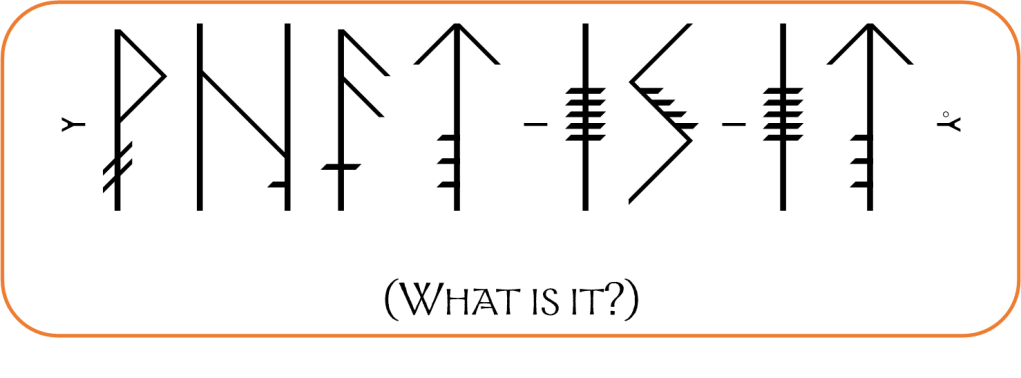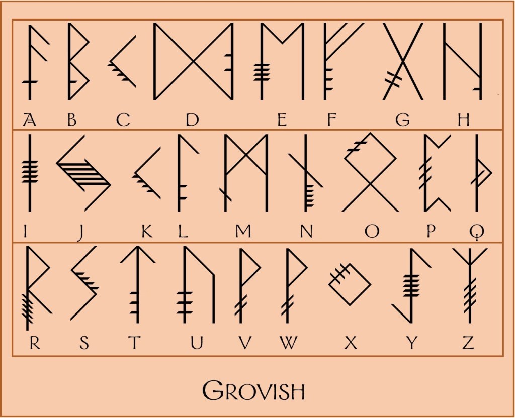 Grovish is the magical language of the Ambergrovians. This is a fictional alphabet/language that is, in its written form, a hybrid of Nordic Elder Futhark runes and Celtic ogham tree letters—with some additional revisions.