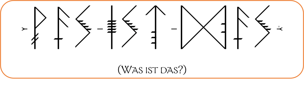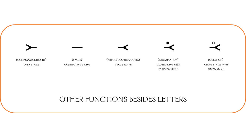 Question marks are represented by close staves with an open circle above them. Exclamation points are represented by close staves with a filled circle above them. Spaces are presented as dashes to ensure word breaks are clear. The format loosely follows ogham written structure.