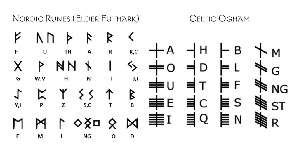 Ambergrove’s pantheon has associated Nordic runes, which are referenced in the Dragonwolf trilogy (the first books in the Tales of Ambergrove saga), particularly when Kip creates a bindrune for Mara and the Great Harbinger’s followers wear a bindrune of their own. However, as much of Ambergrove is also a nature-focused world, ogham and the meaning behind the tree language, used by nature beings and magical creatures, was embraced by many peoples as well. Wanting to create a universal language to allow all Ambergrovians to understand one another, the goddess of wisdom combined the two sacred written languages together to create one language. Some runes are repurposed to ensure the Earther standard alphabet (the Latin alphabet) is fully represented. Additional hashes are added to letters that did not have standard ogham lettering or representation.