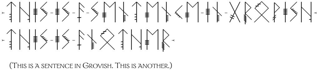 After developing the Grovish language, I used an online tool called FontStruct to create Grovish as a TrueType file. This was my first time doing something like that, so there are certainly some hiccups. Unfortunately, the sizing and spacing are a little unintuitive (the letters have to be large to be legible and there’s a lingering dash at the end of each paragraph), but this accurately represents the language. If you are more experienced with font creation and TrueType files and would like to create a better version for your fellow adventurers, please contact the author through the website contact page.